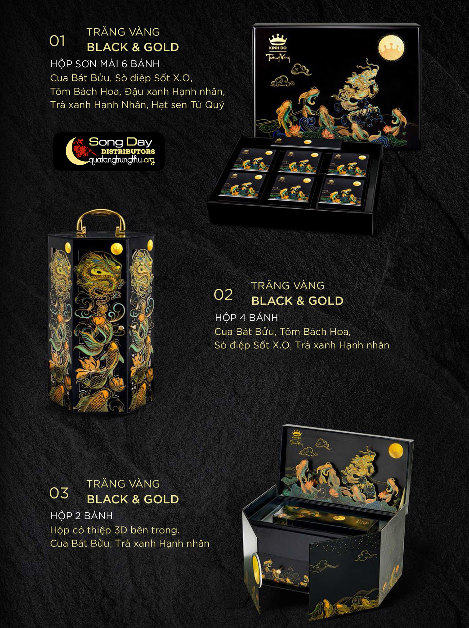 Là những hộp bánh trung thu cao cấp của nhất của Kinh Đô vào dịp Tết trung thu mỗi năm, chỉ mới ra dời vài năm trở lại đây nhưng bộ sưu tập Black and Gold này rất được ưa chuộng và lựa chọn làm quà tặng cao cấp. Bộ sưu tập này lấy ý tưởng từ Hoàng Gia với hộp bánh từ hình ảnh câu chuyện Cá chép hóa rồng,…biểu tượng cho sự an lành, phát đạt, thịnh vượng và hạnh phúc.